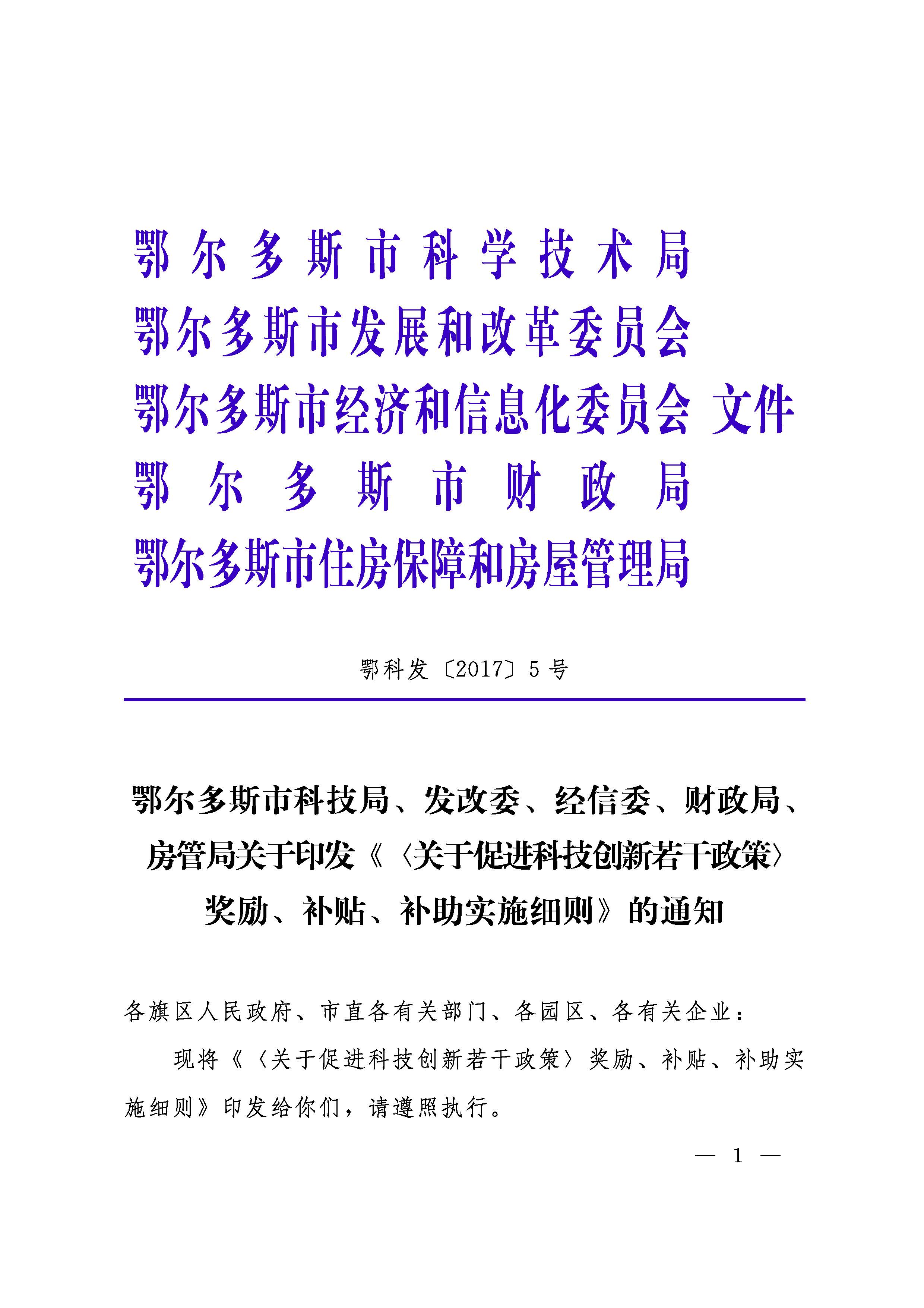 鄂尔多斯市科技局、发改委、经信委、财政局、房管局关于印发《<关于促进科技创新若干政策>奖励、补贴、补助实施细
