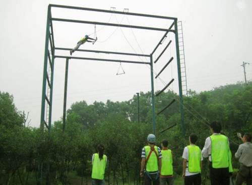 项目描述:要求所有的队员必须依次独立的爬上立柱,在圆盘上站稳后,双腿同时用力蹬出,双臂前伸抓住挂在前方的单杠。